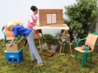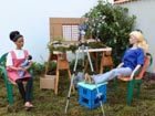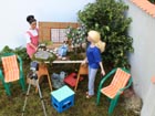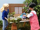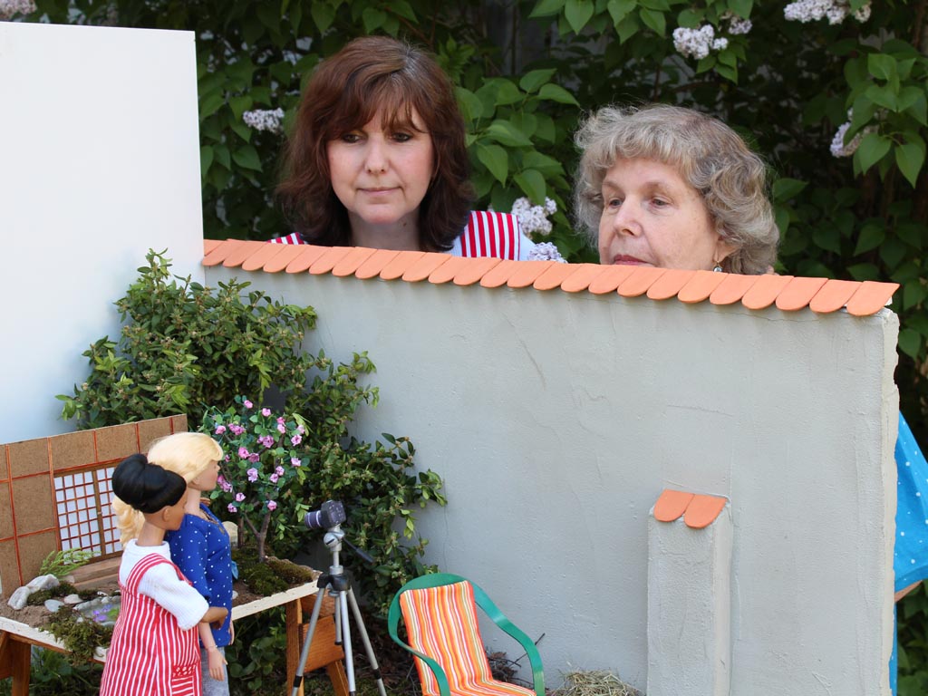 přijdou ke stěně domku. Zatímco Izabela plní jezírko vodou a opatrně jej zdobí