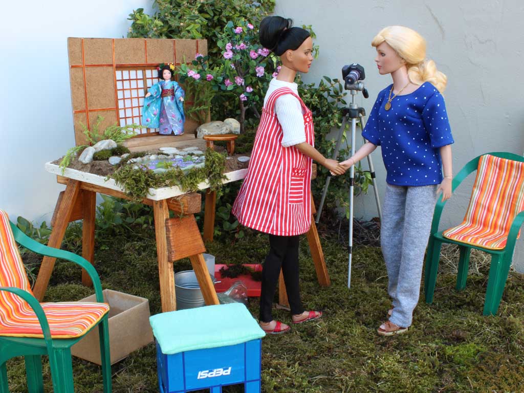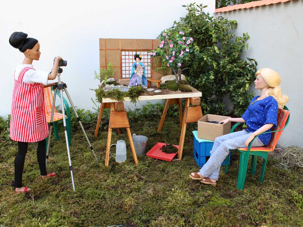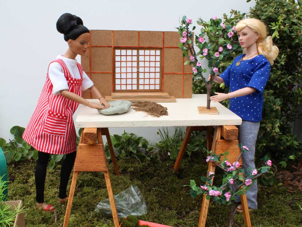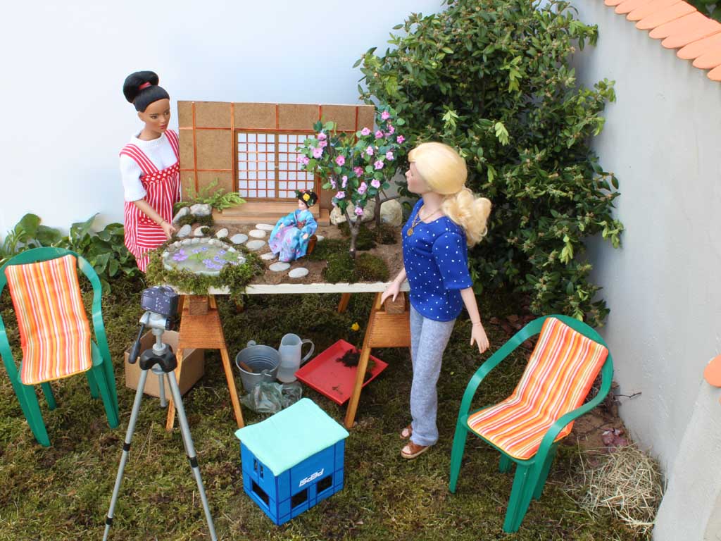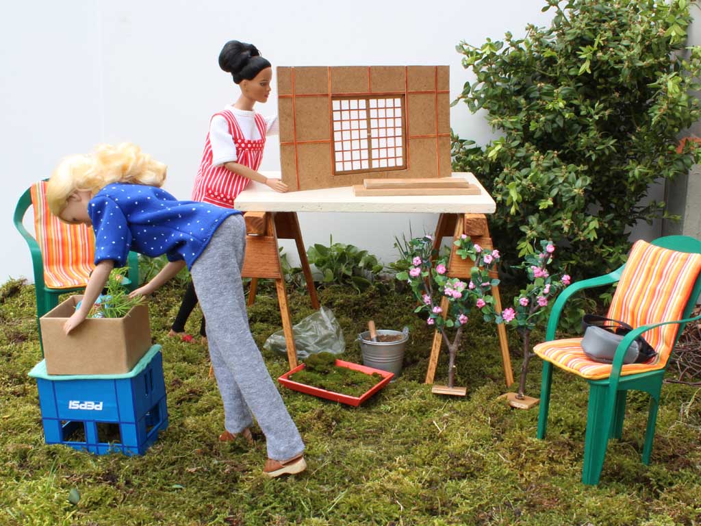 osází kamínky. Zadní stěna představující japonský domek je ze sololitu. Terén