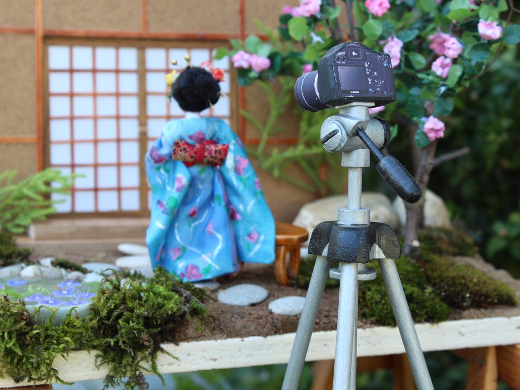 vyfotografovaný zmenšený dekor. Stativ je ze dřeva stejně jako fotoaparát, který