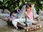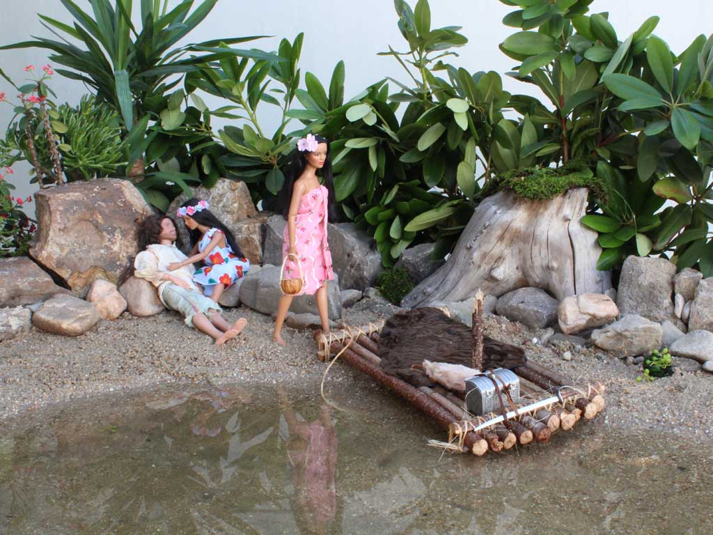 plavidlo s ležící postavou. Společnými silami vytáhnou vor na pláž