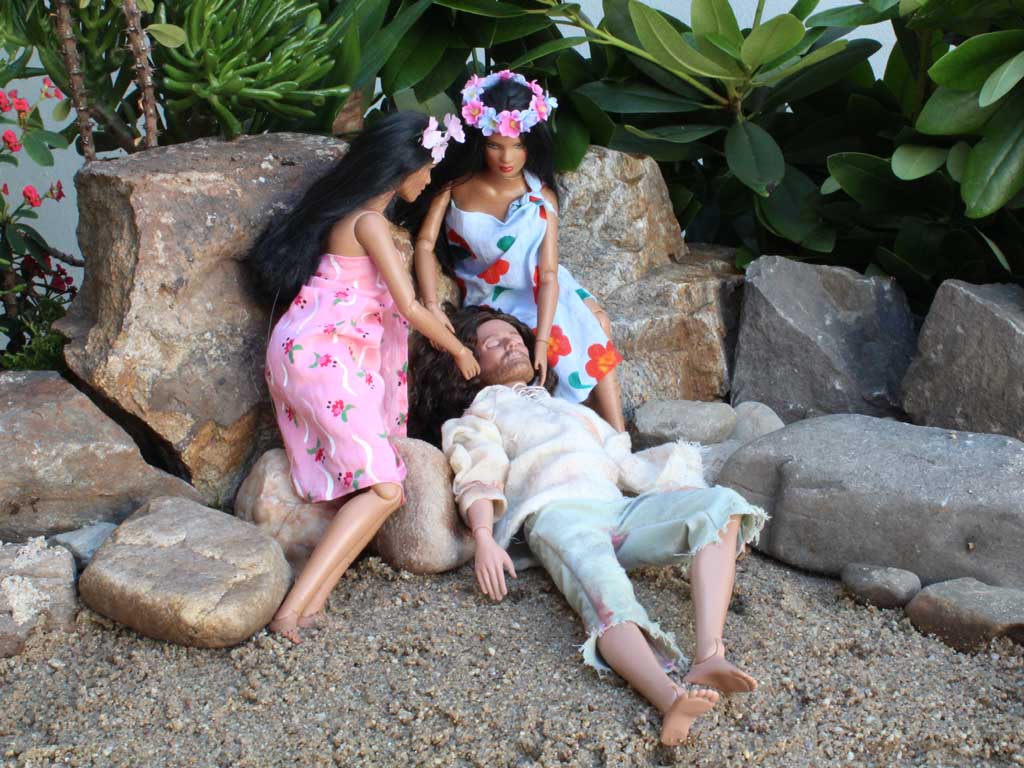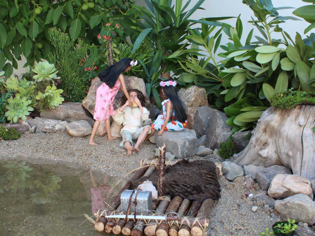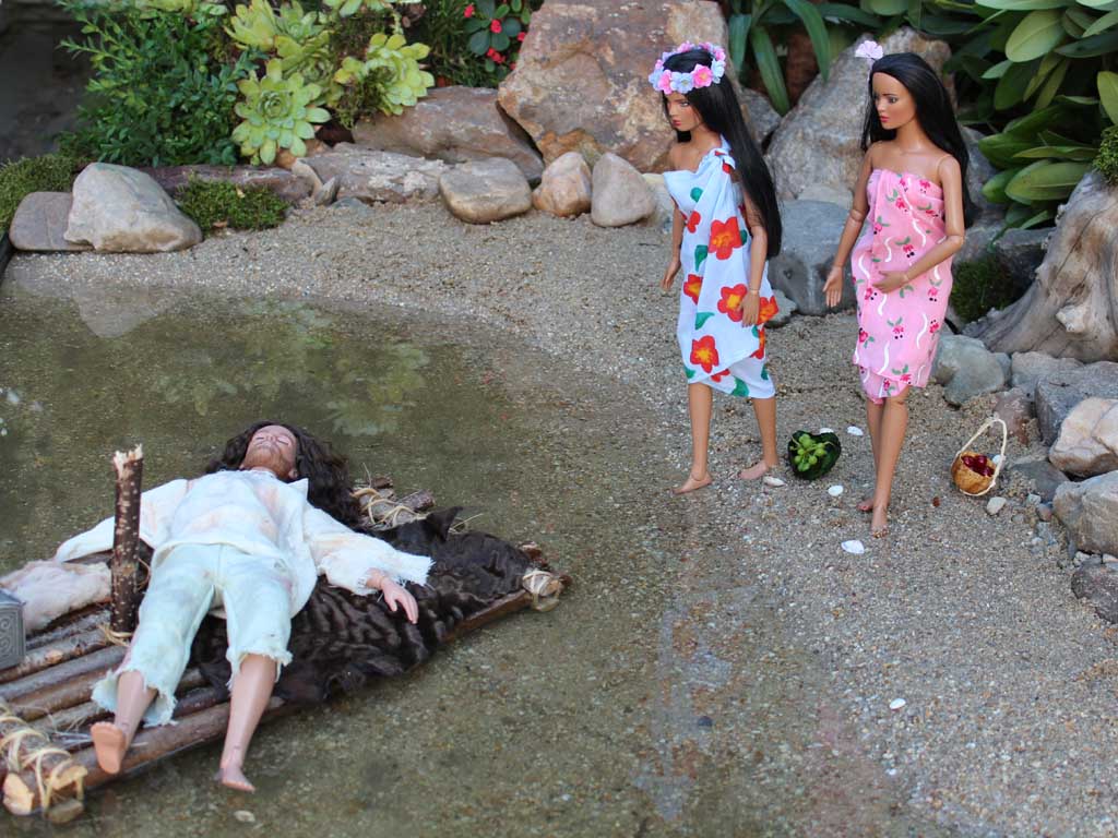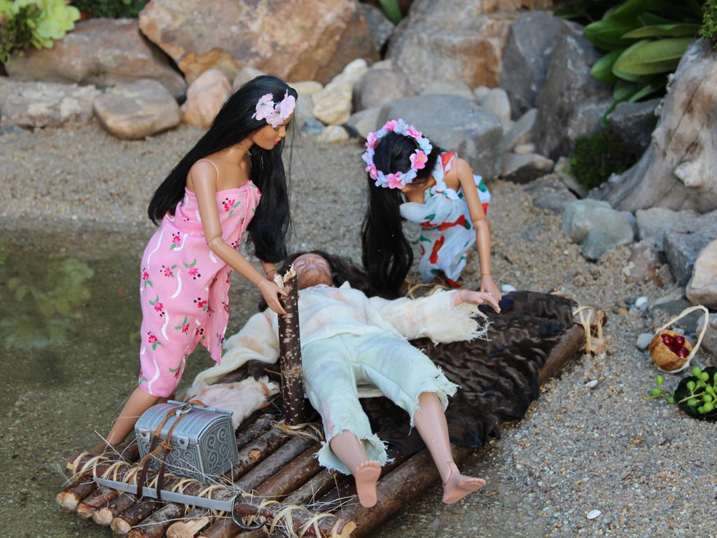 zjišťují, že trosečník dosud žije. Jedna z dívek spěchá pro vodu, druhé se