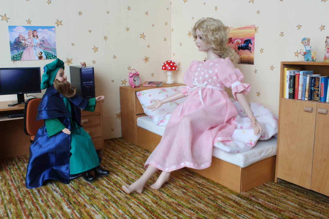hned skřítkovi popisuje svoje "trápení"s rodiči a žadoní, aby jí splnil tajné