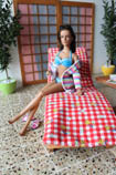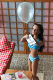 plavky z pružné látky, plážový kabátek je součástí jejího originálního oblečení, pantofle