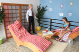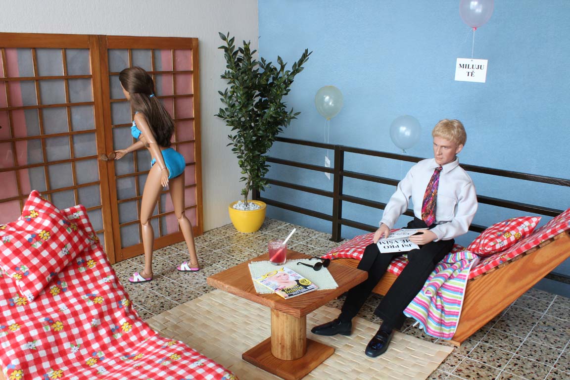 Odpoledne si vyjde ze svého domácího vězení na terasu, je krásný slunný den a