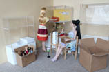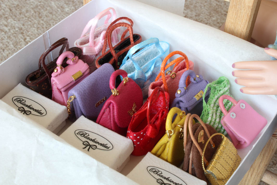 miniaturní botičky a kabelky. Děvčata mají vše roztříděné v papírových